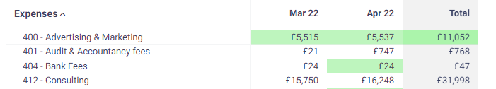 You can compare the results against other periods (get a breakdown by month or quarter) or breakdown the results down by company or category using the Compare option. You can select multiple options to compare across multiple dimensions, e.g. by period and category. The options available are: