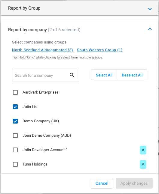 You also have the option to search for companies and Select All or Deselect All companies. Once you've selected your companies click on the Apply Changes button to run the report.