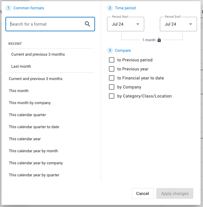 This section provides a common list of reporting formats for quick access. Clicking on a format will set the Time Period and Compare filters (see below) automatically. After choosing, click on Apply Changes to run the report.