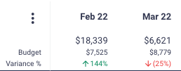 If you have chosen to show variance columns, those columns highlight the difference between the budget amount and the actual amount. The arrow icons show whether the variance is an increase (up arrow) or decrease (down arrow), and whether it’s favourable (green) or unfavourable (red).