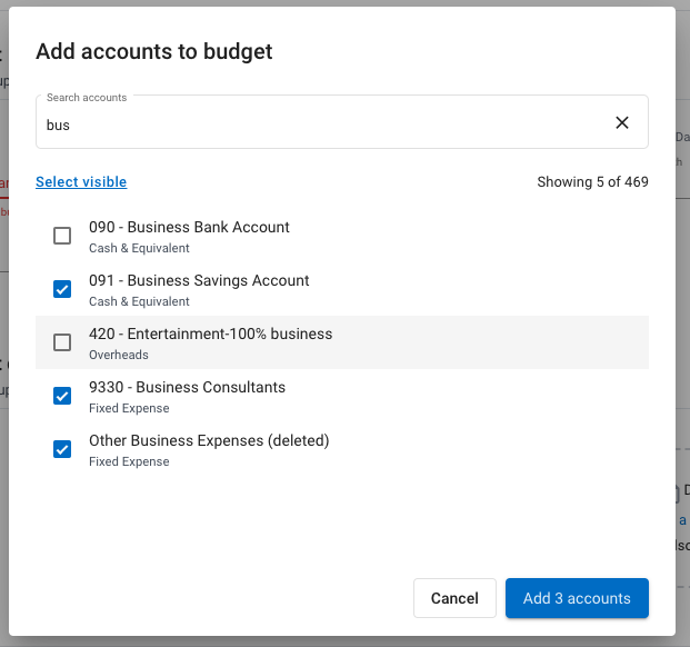 This will bring up a form to select the accounts you wish to enter budget data for. This will show all the accounts from all your connected companies - if you have selected a specific company for your Budget only the accounts from that company will be displayed. You can search for accounts by typing the name/code/type in the search box.