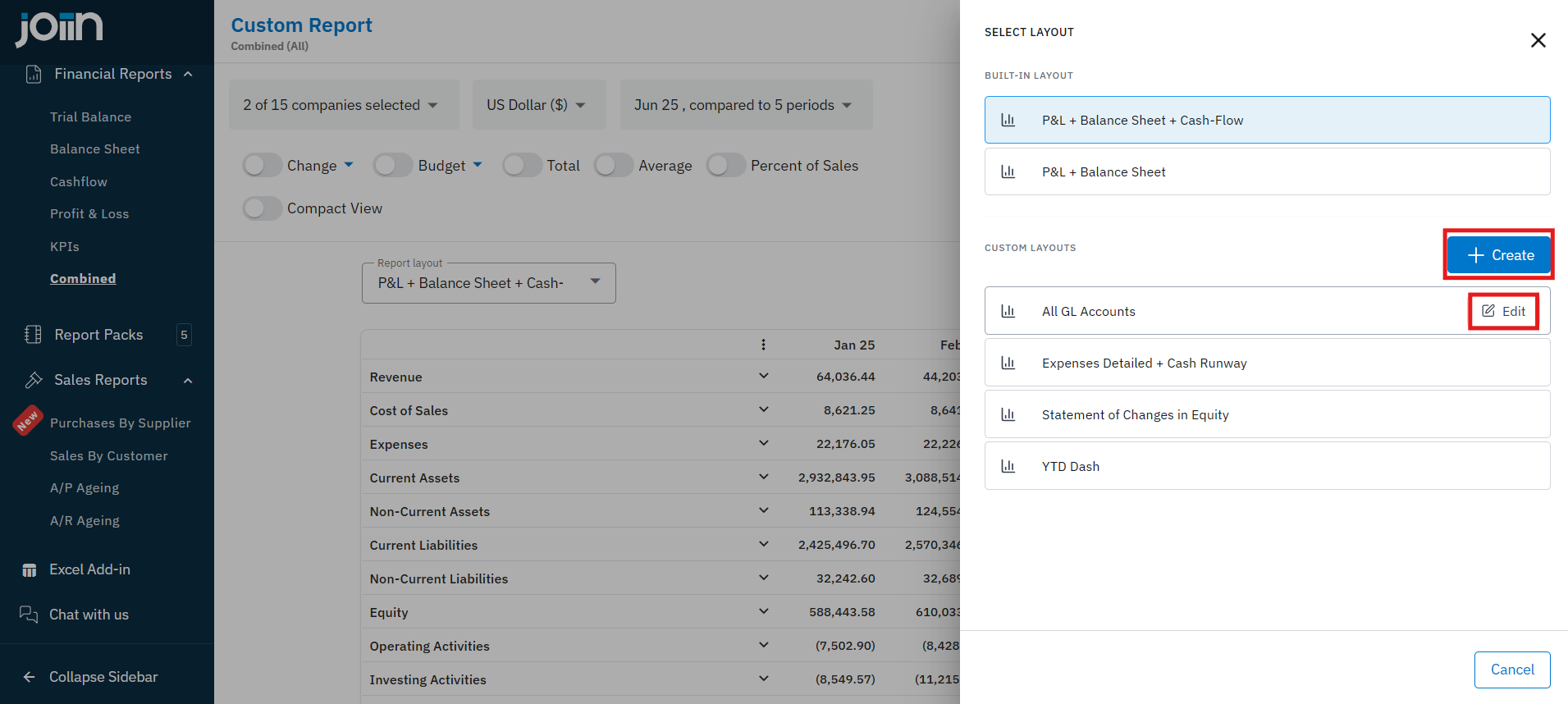 1. Edit a report layout by running the report and clicking the Report Layouts box. From here, select Create or Edit to access the editing page