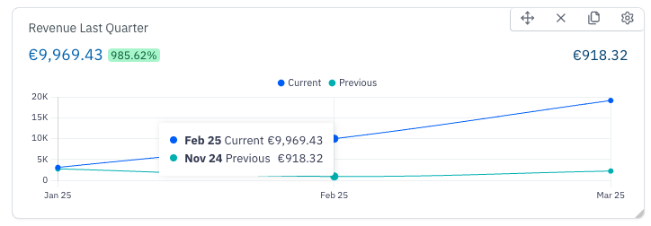 Displays a single value for the whole period for each selected KPI. Includes a comparison percentage if you have chosen to include a compare option.