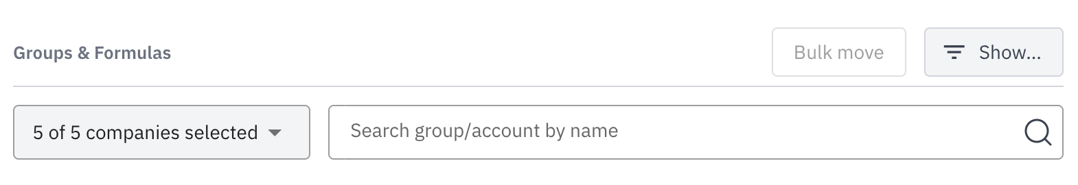 To search for a group or account simply enter your search text in the search box on the right. Search will be performed across all groups, formulas, account codes and names and the matching items will be filtered as you type.