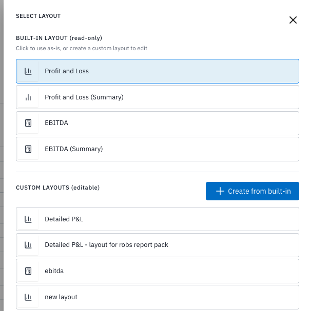 When you run any of the standard financial reports (Profit & Loss, Balance Sheet etc.) you can select the layout from the Report layout dropdown. By default, the Built-in Layout for that report will be used. Click on the layout dropdown and you can select, create, edit or delete a custom layout. See the Running Reports article for more information.