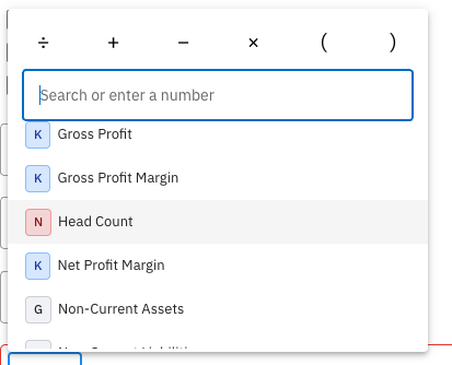 Non-Financial Data items appear in the Formula Editor with the red N icon - so they can be easily used along with KPIs, Groups and other Formulas to build custom KPIs.