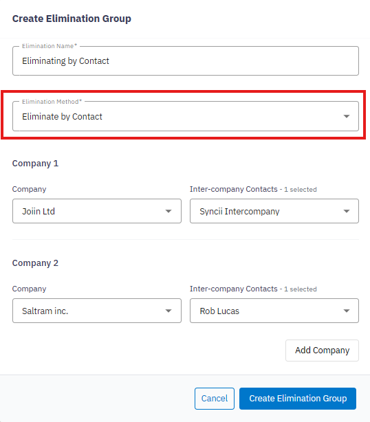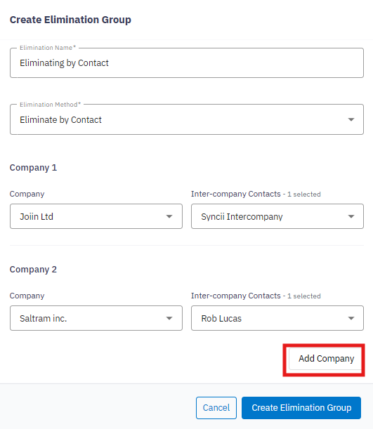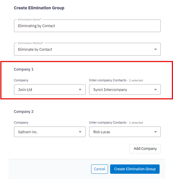 5. In the first line titled Company 1, select a Company and Contact to eliminate